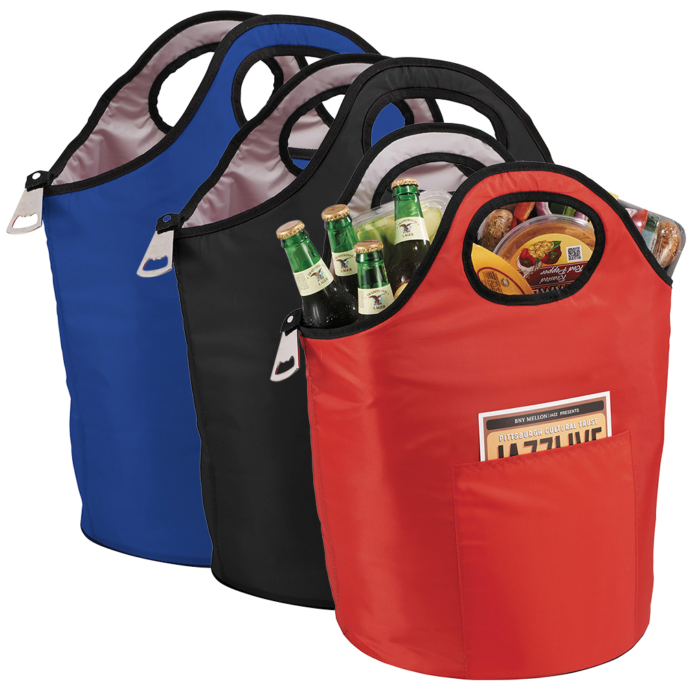 Large open insulated main compartment, double grab handles and metal bottle opener included.